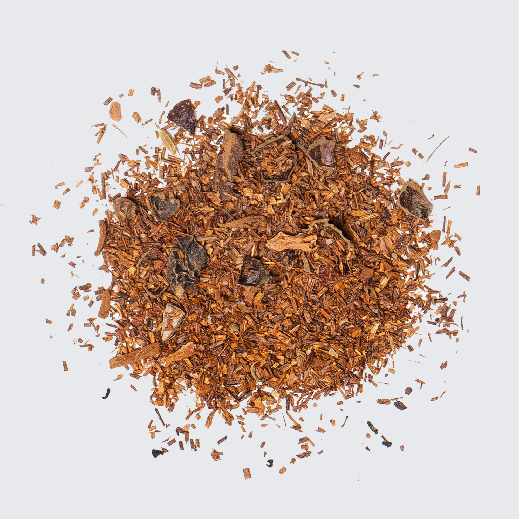 Rooibos, cranberries, coconut, vanilla, cocoa nibs, rose hips, anise seed, fennel seed, cocoa powder, monk fruit sweetener, maca powder, cardamom powder, cinnamon powder, ginger powder, nutmeg powder, rose bud & petals, pomegranate vanilla extract, safflower.